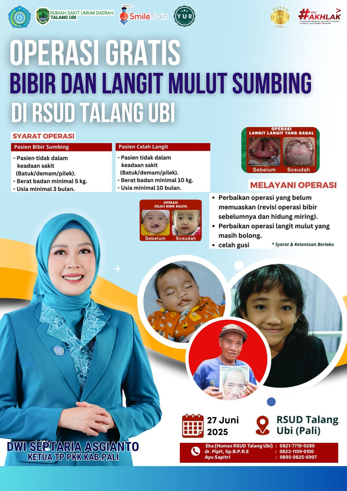 Kegiatan ini akan dilaksanakan pada 27 Juni 2025 di RSUD Talang Ubi dan diperuntukkan bagi anak-anak maupun pasien dewasa yang membutuhkan tindakan korektif pada bibir dan langit mulut.