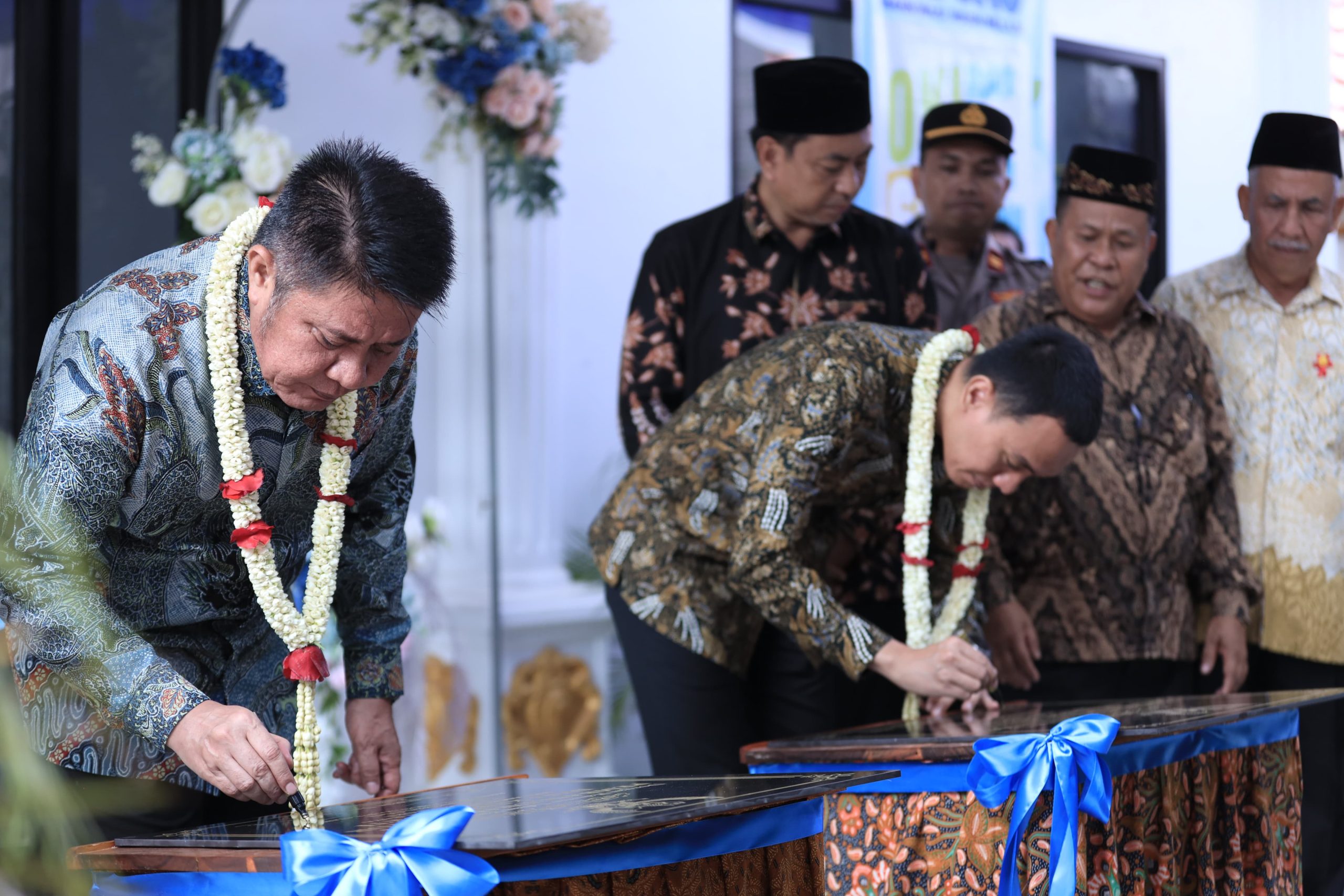 Didampingi Bupati OKI Muchendi Mahzareki, Gubernur Herman Deru menandatangani prasasti peresmian sebagai bentuk penghargaan terhadap kerja sama kolektif warga Desa Kerta Mukti.