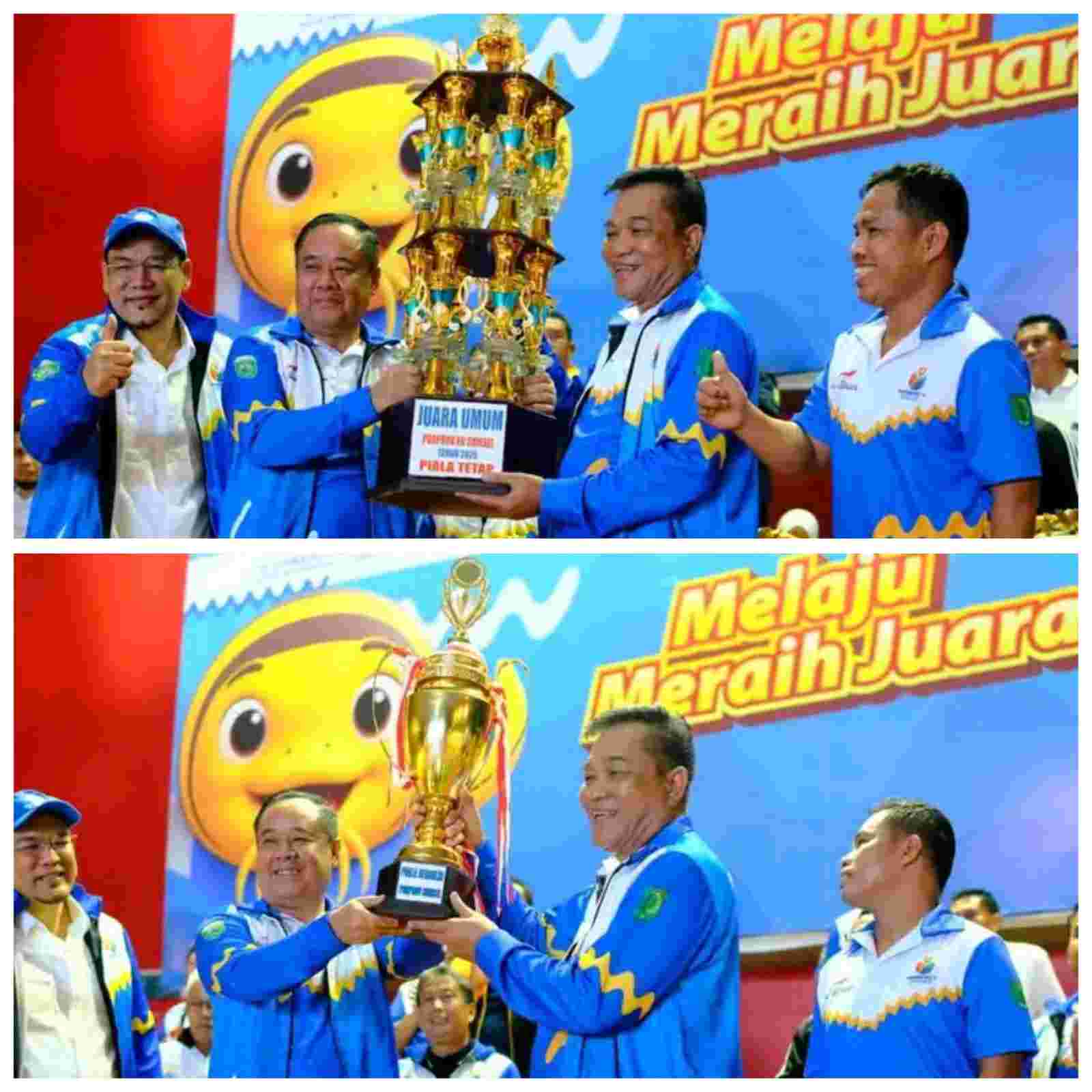 Trofi juara umum diserahkan langsung oleh Wakil Gubernur Sumsel H Cik Ujang kepada Bupati Musi Banyuasin H M Toha Tohet SH di hadapan ribuan masyarakat Muba yang memenuhi arena penutupan.