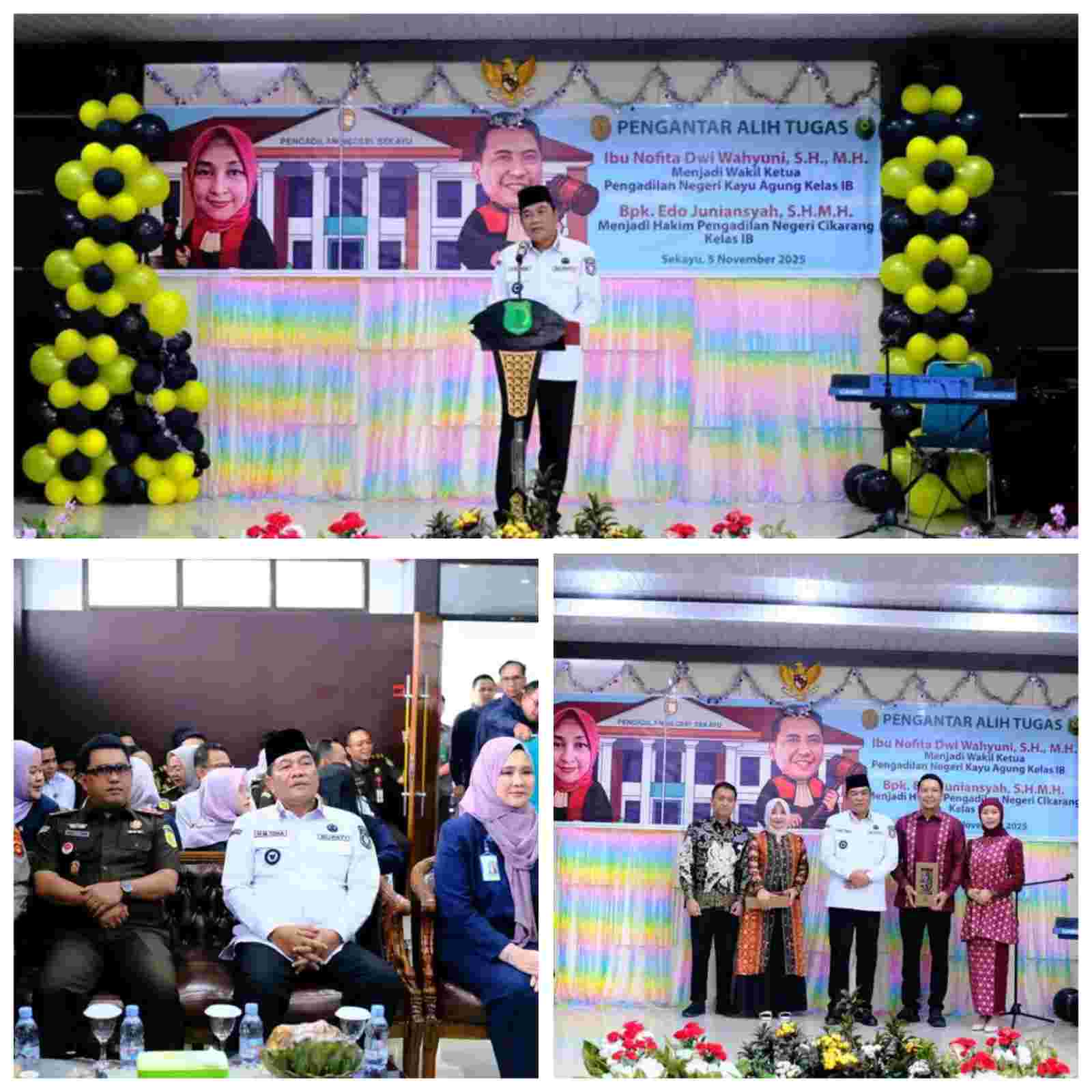 Pilarinfomasi.com MUBA – Bupati Muba HM. Toha Tohet, SH., menghadiri acara Pengantar Alih Tugas dua pejabat Pengadilan Negeri (PN) Sekayu, yakni Nofita Dwi Wahyuni, SH., MH. yang kini menjabat sebagai Wakil Ketua PN Kayuagung, serta Edo Juniansyah, S.H., MH., yang akan bertugas sebagai Hakim PN Cikarang. Kegiatan berlangsung hangat di Kantor Pengadilan Negeri Kelas I.B Sekayu, Rabu (5/11/2025).