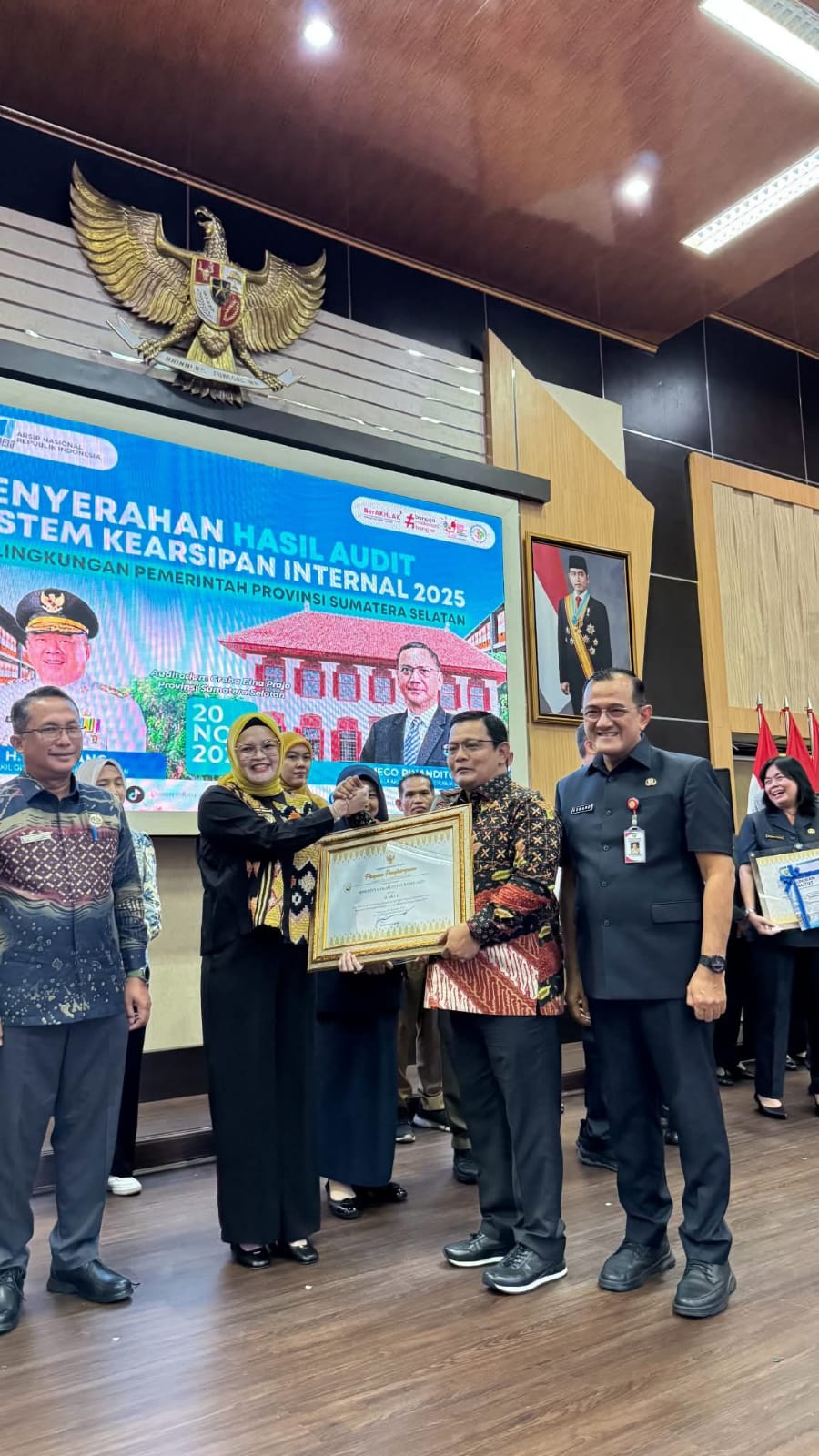 Penghargaan diserahkan oleh Deputi Bidang Tata Kelola Kearsipan Nasional, Dr.Andi Abubakar.,S.IP.,M.Si didampingi oleh Sekretaris Daerah Provinsi Sumatera Selatan, Drs. H. Edward Candra, MH, diterima langsung oleh Wakil Bupati Banyuasin, Netta Indian, SP didampingi oleh Kepala Dinas Perpustakaan dan Kearsipan Kabupaten Banyuasin, Mulyanto, AP., M.Si di Graha Bina Praja Palembang, Kamis (20/11/2025).
