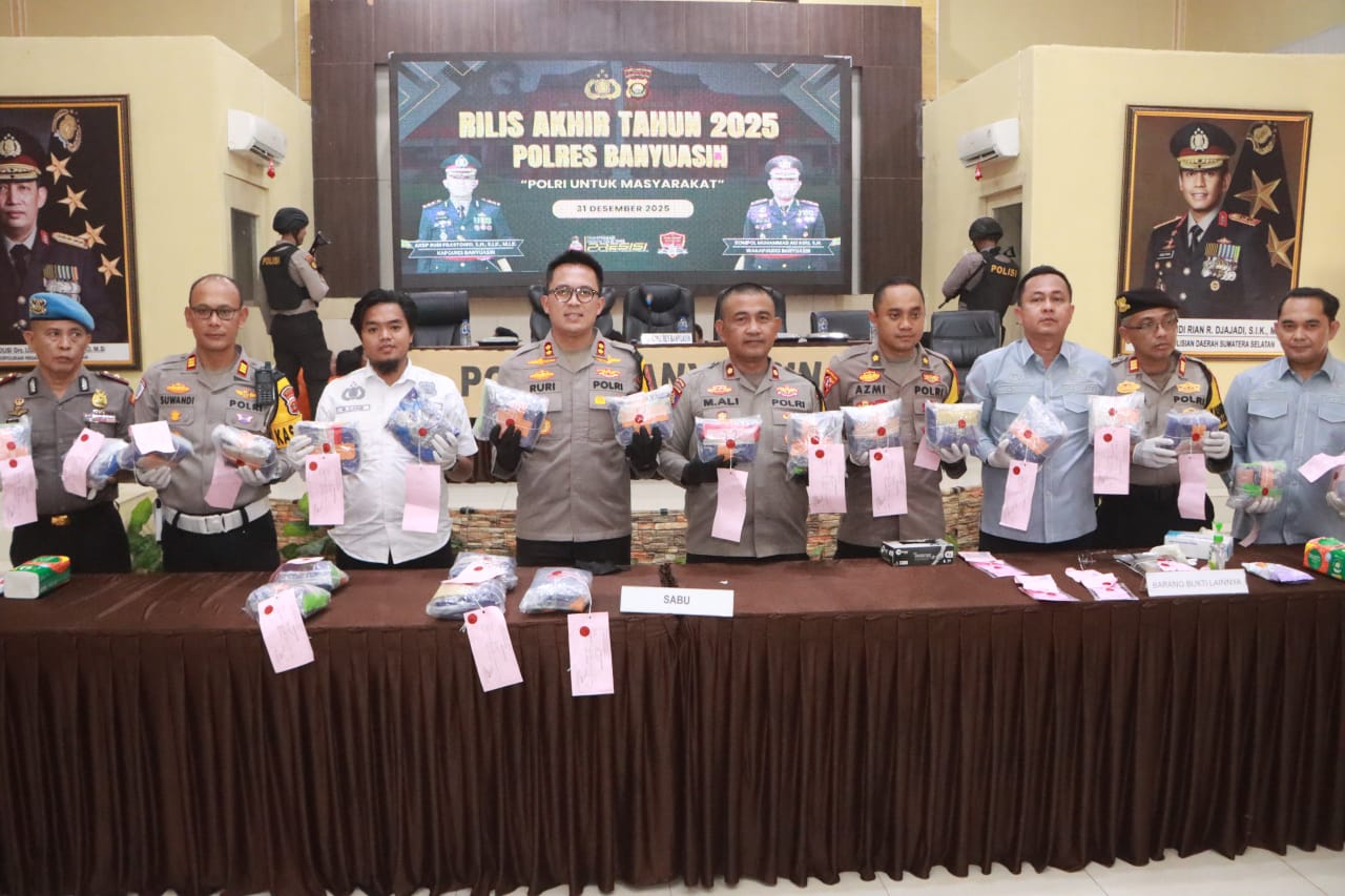 Pilarinformasi.com, Banyuasin – Polres Banyuasin menggelar konferensi pers akhir tahun 2025 pada Rabu (31/12/2025) sekitar pukul 11.00 WIB di Gedung Serbaguna Sanika Satyawada Polres Banyuasin. Acara yang berlangsung hingga pukul 12.00 WIB tersebut berjalan aman dan kondusif.