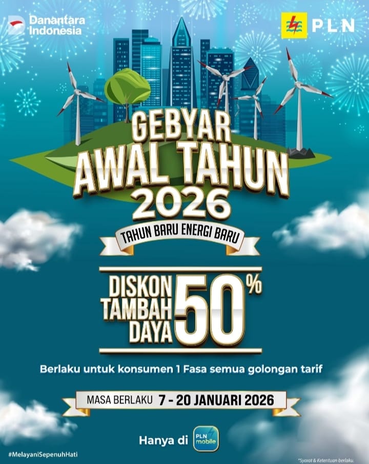 Pilar informasi.com Jakarta, – Gebyar Awal Tahun 2026, PT PLN (Persero) kembali memberikan apresiasi kepada pelanggan melalui program spesial bertajuk “Tahun Baru Energi Baru”. Program ini menghadirkan promo tambah daya listrik diskon 50% bagi pelanggan yang melakukan transaksi pada aplikasi PLN Mobile.