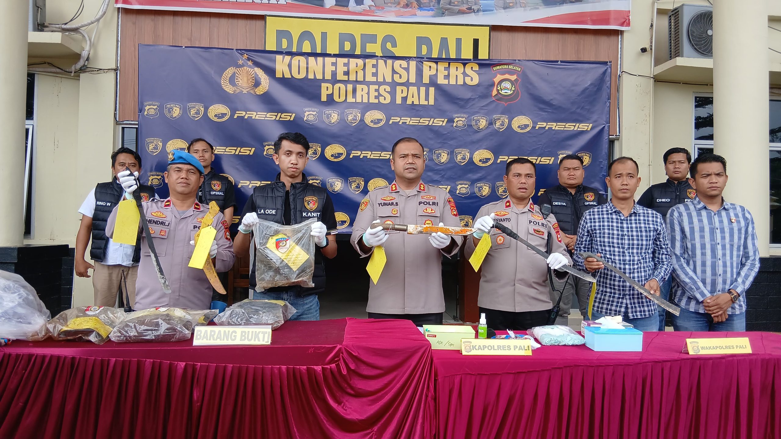 Kapolres PALI AKBP Yunar Hotma Parulian Sirait, S.H., S.I.K., M.I.K, didampingi Kasat Reskrim AKP Nasron Junaidi, S.H., M.H, serta jajaran Pejabat Utama (PJU), membenarkan penangkapan dua tersangka tersebut.