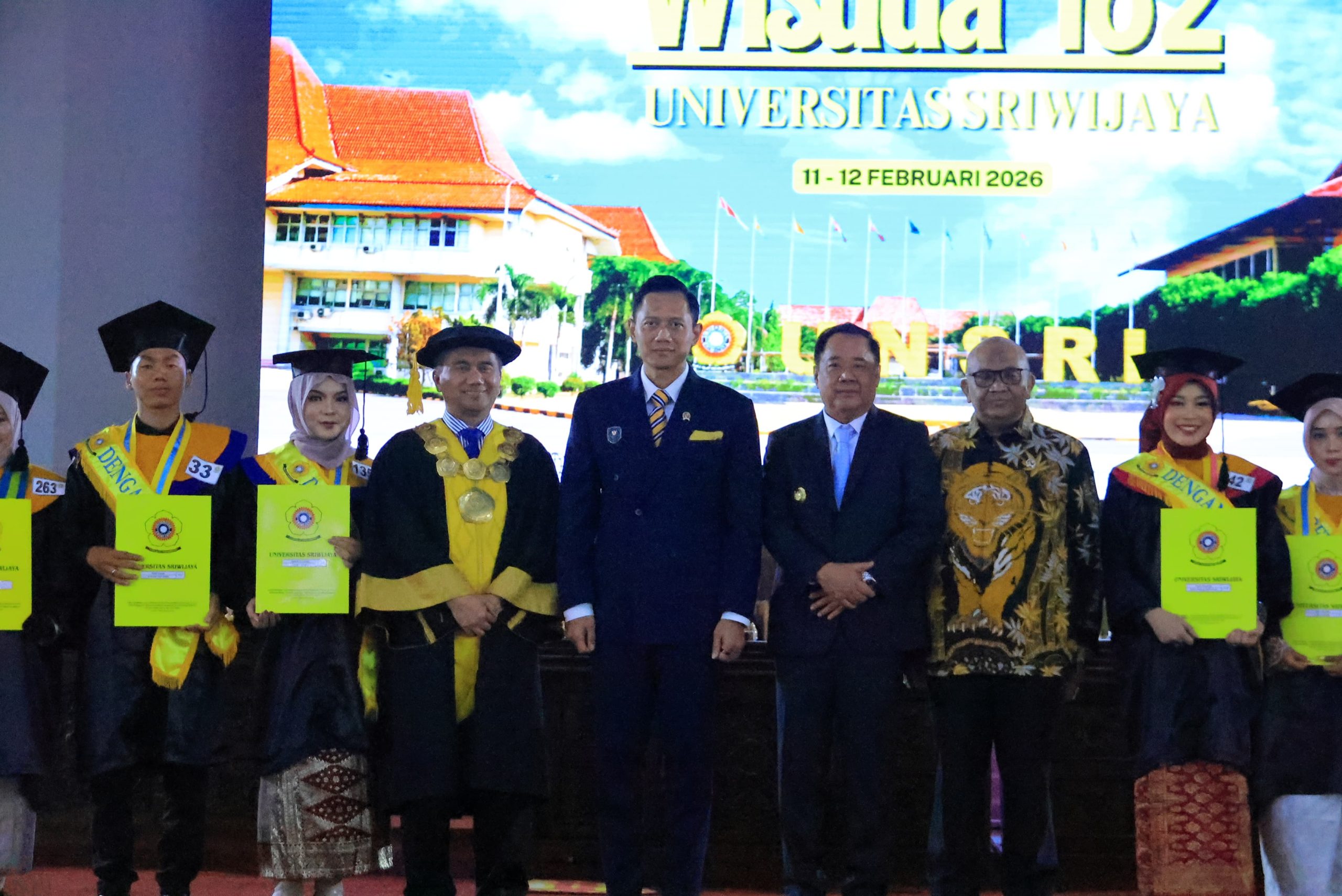 Pilar informasi.com Ogan Ilir – Wakil Gubernur Sumatera Selatan (Sumsel) H. Cik Ujang mendampingi Menteri Koordinator (Menko) Bidang Infrastruktur dan Pembangunan Kewilayahan RI, Agus Harimurti Yudhoyono (AHY), menghadiri Wisuda ke-182 Universitas Sriwijaya (Unsri) di Indralaya, Kabupaten Ogan Ilir, Rabu (11/2/2026).