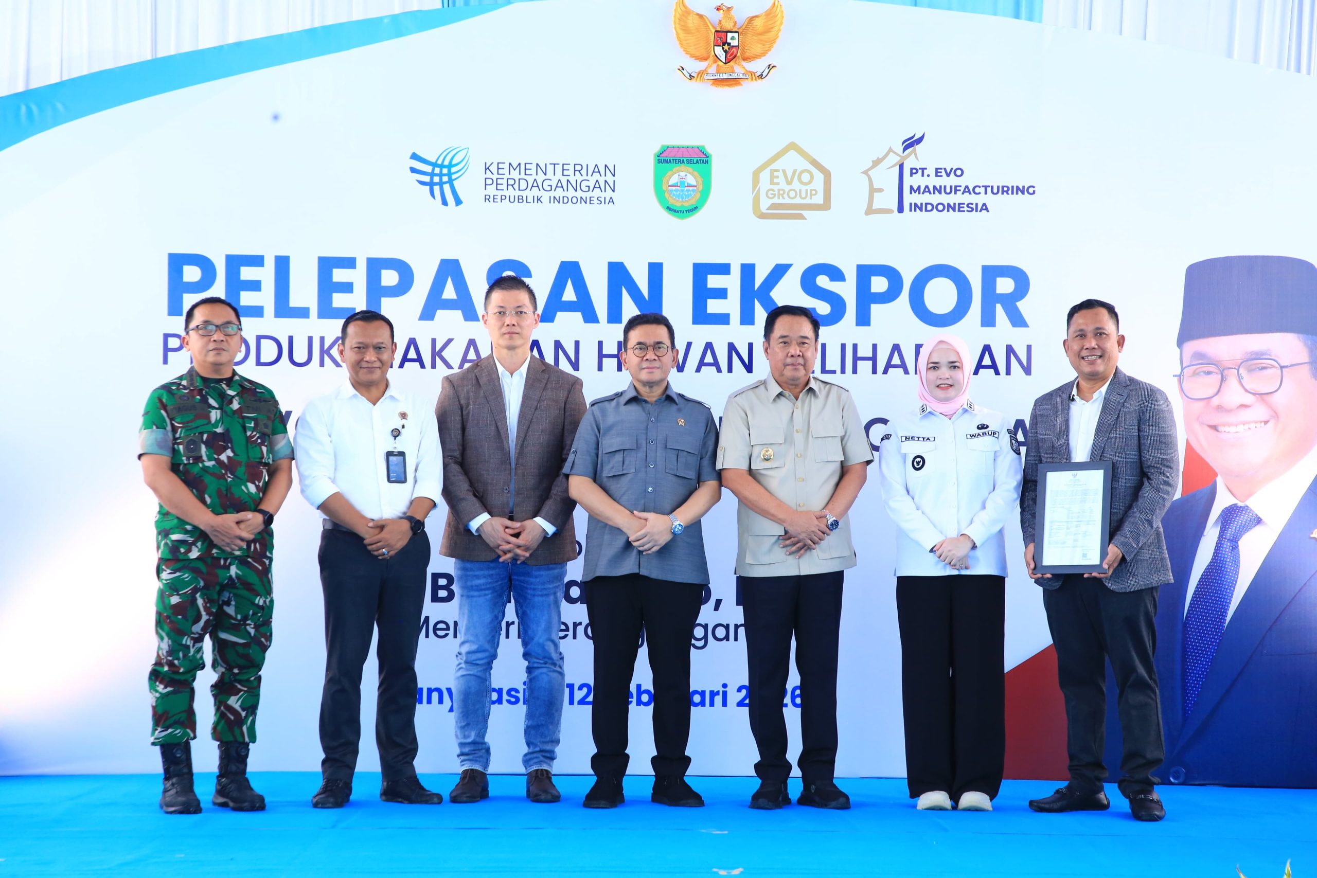 Pilar informasi.com BANYUASIN — Menteri Perdagangan RI Dr. Budi Santoso, M.Si., bersama Wakil Gubernur Sumatera Selatan (Sumsel) H. Cik Ujang melepas ekspor perdana produk makanan hewan peliharaan ke Filipina dari pabrik PT Evo Manufacturing Indonesia (EMI) di Desa Karang Anyar, Sumber Telang, Banyuasin, Kamis (12/2/2026).